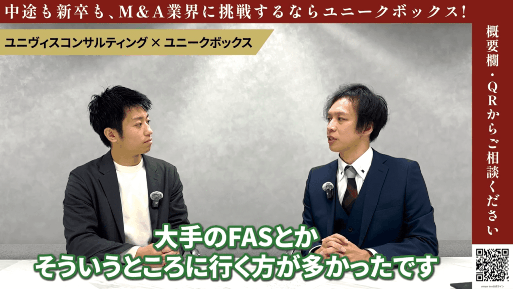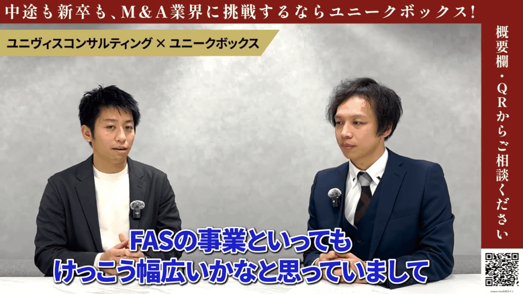 大冨: FAS事業部は、我々が今まで主にご紹介をしてきたM&A仲介会社とは少し異なります。しかしM&A関連の業種、そして非常に重要なM&Aのプロセスの中で役割を果たされているので、そういったポジションにご興味があるよという方はぜひご覧いただければと思います。