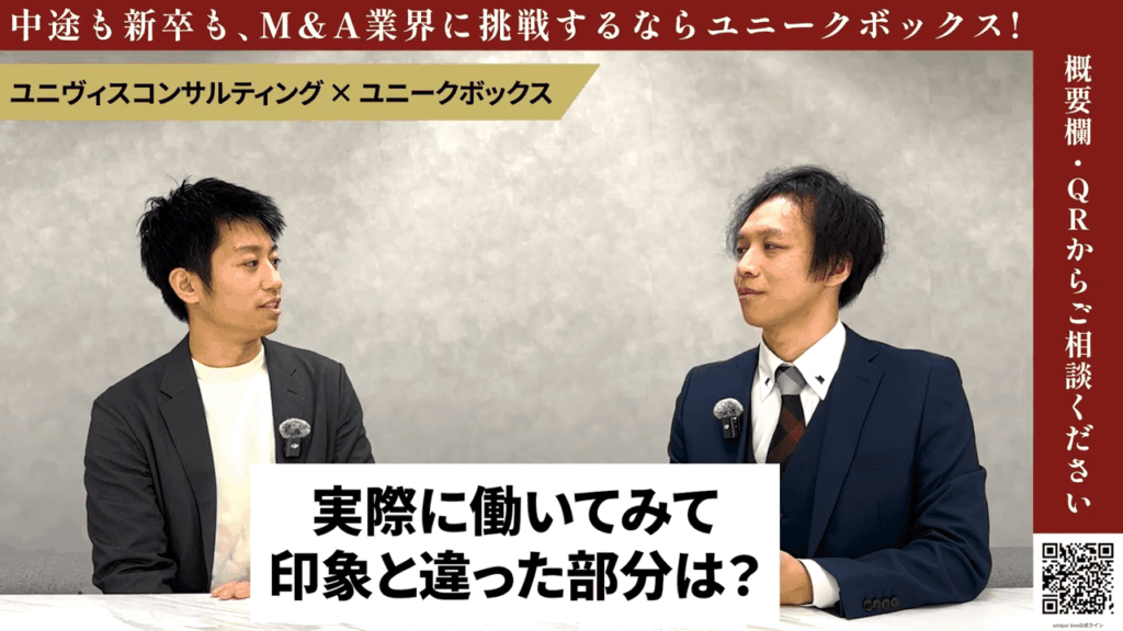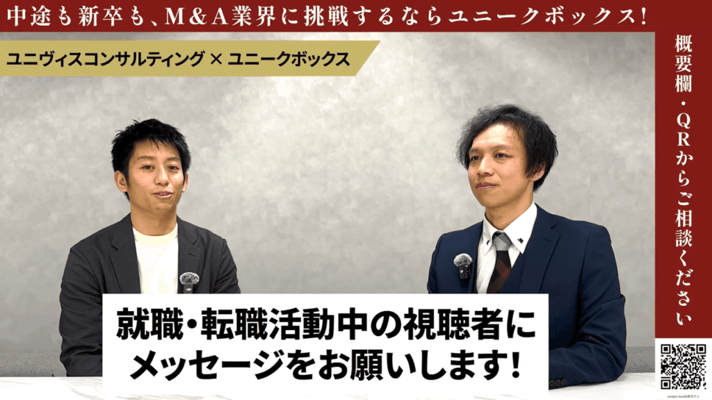 釜屋氏: 弊社ユニヴィスコンサルティングは、本当にチャレンジをしたい、自分自身のキャリアを広げていきたい、そういった強い希望を持ってる方に対して、非常に向いている職場です。また、人間関係で悩んでいらっしゃる方も、弊社でしたら本当に優秀なメンバー、そして温かいメンバーが多い職場となっておりますので、自身のさらなるキャリアの可能性を広げながら、楽しく仕事をしてきたい、そういった方に是非入社していただきたいと思っております。どうぞよろしくお願いいたします。